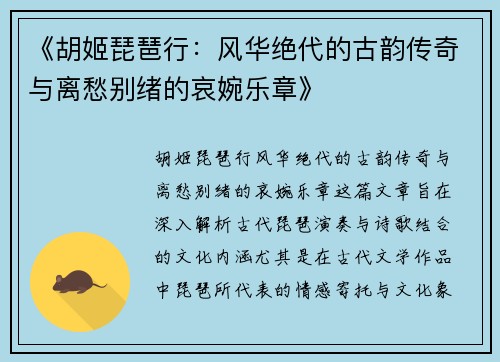 《胡姬琵琶行:风华绝代的古韵传奇与离愁别绪的哀婉乐章》这篇文章旨在深入解析古代琵琶演奏与诗歌结合的文化内涵,尤其是在古代文学作品中琵琶所代表的情感寄托与文化象征。本文通过四个方面,分别从《胡姬琵琶行》的历史背景、文学价值、艺术表现以及情感表达进行详细分析,力图揭示琵琶这一传统乐器如何在古代文化中成为情感与美学的双重载体。同时,文章还会探讨作品中的离愁别绪与诗歌中的韵律、意象如何交织成一幅永恒的艺术画卷。通过这些分析,本文将阐明《胡姬琵琶行》如何在风华绝代的艺术传承中,与离愁别绪的情感深处发生共鸣,成为文学与艺术的珍贵遗产。